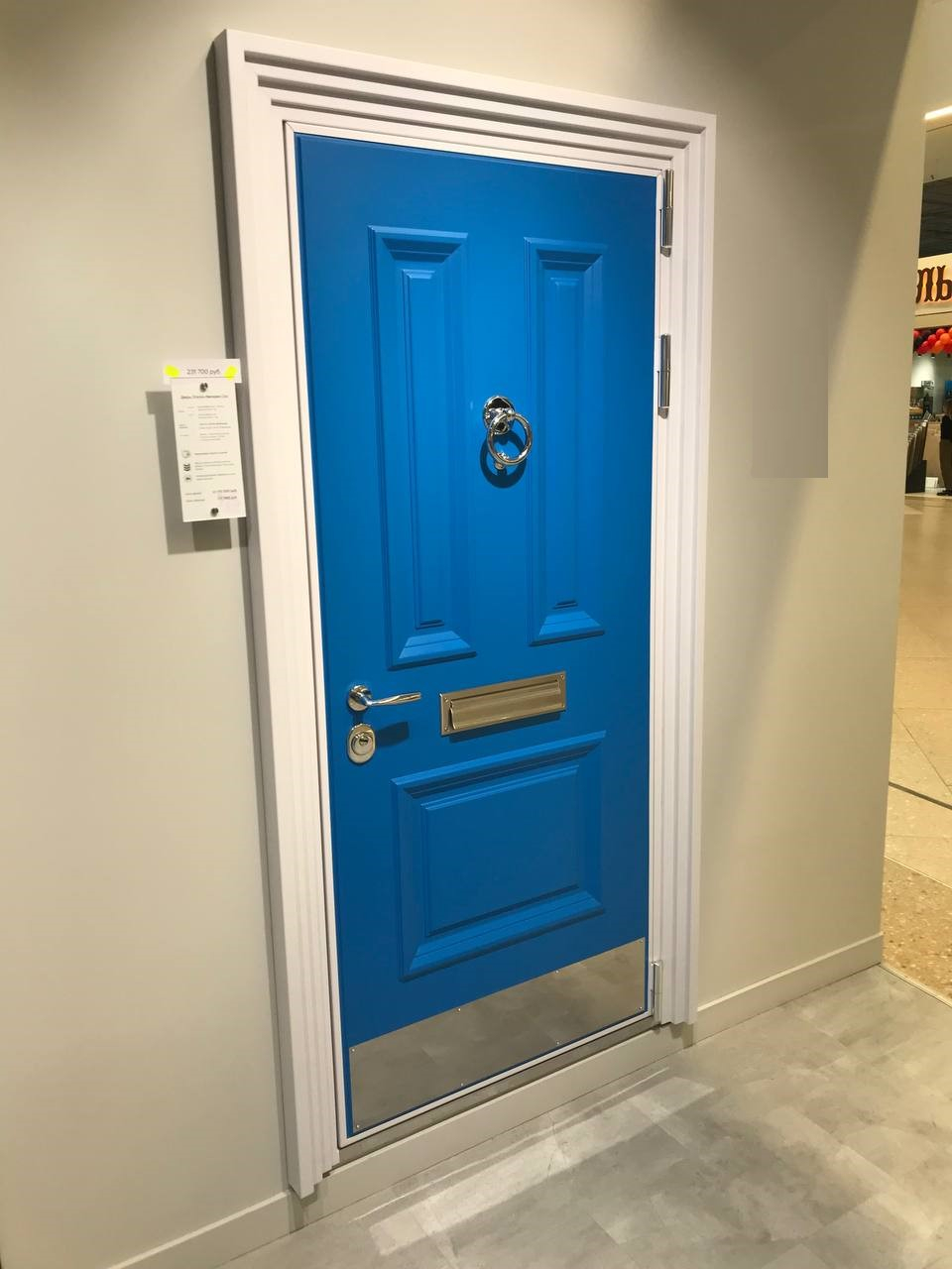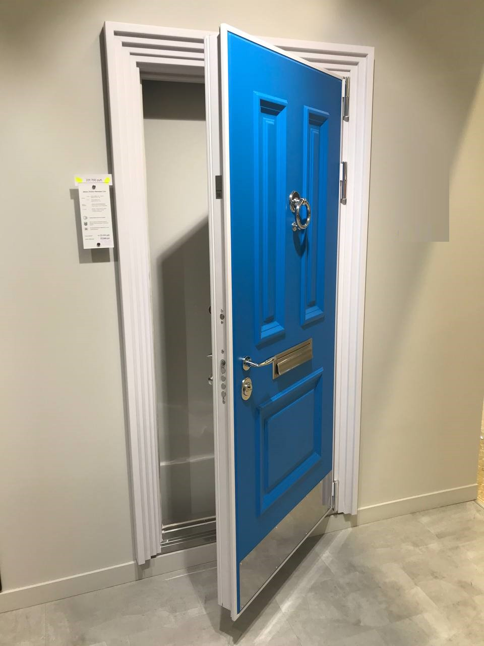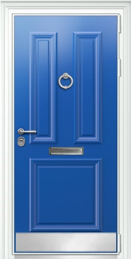 Внешняя отделка: МДФ-панель(16 мм) с объемными багетами, Эмаль цвет Синий Ral 5015 + Белые фигурные наличники металл;